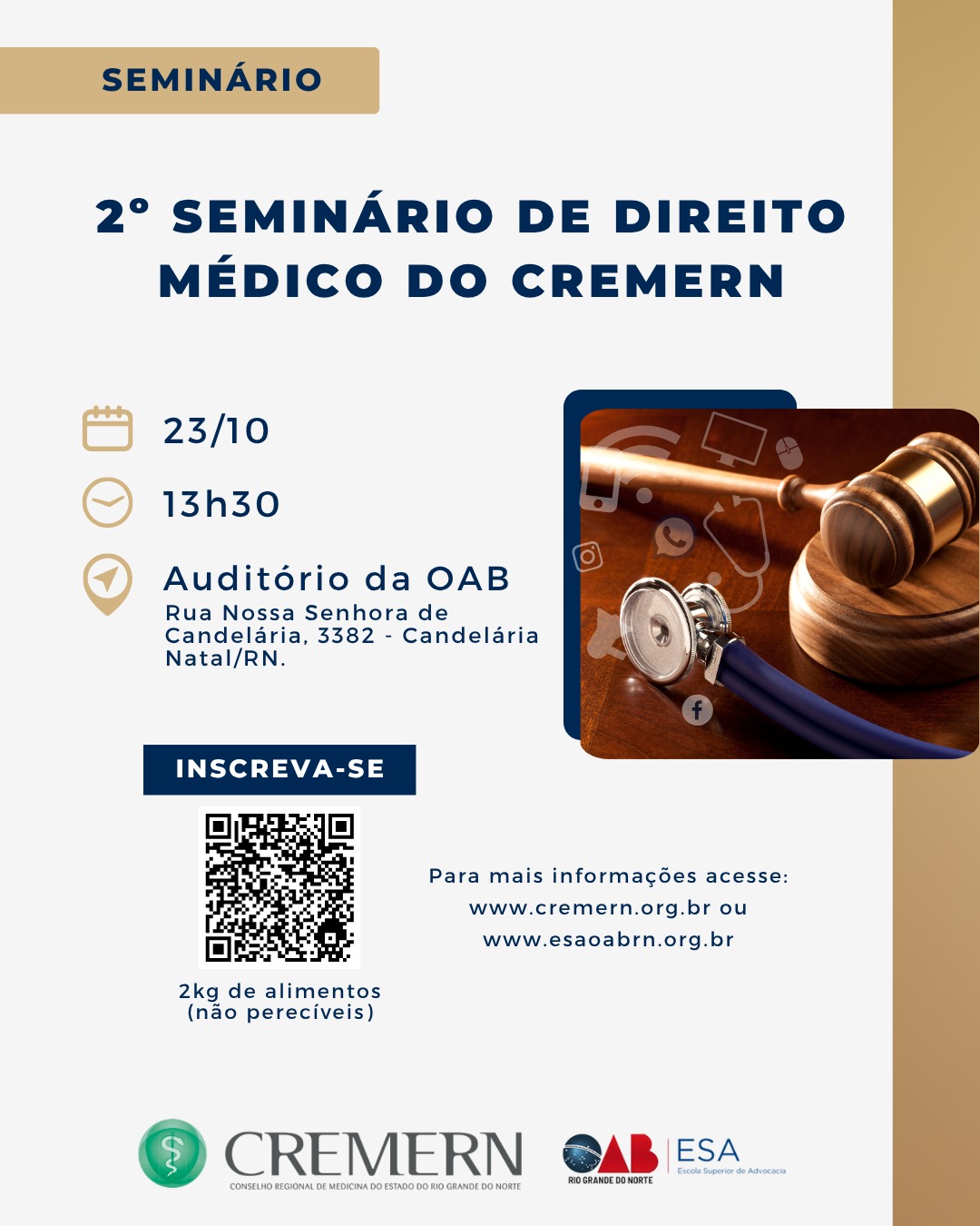 O Conselho Regional de Medicina do Rio Grande do Norte (CREMERN), em parceria com a Ordem dos Advogados do Brasil – Seccional RN (OAB/RN), promove no dia 23 de outubro de 2025 (quinta-feira) o 2º Seminário de Direito Médico, evento que discutirá os principais desafios e avanços na relação entre o Direito e a Medicina.