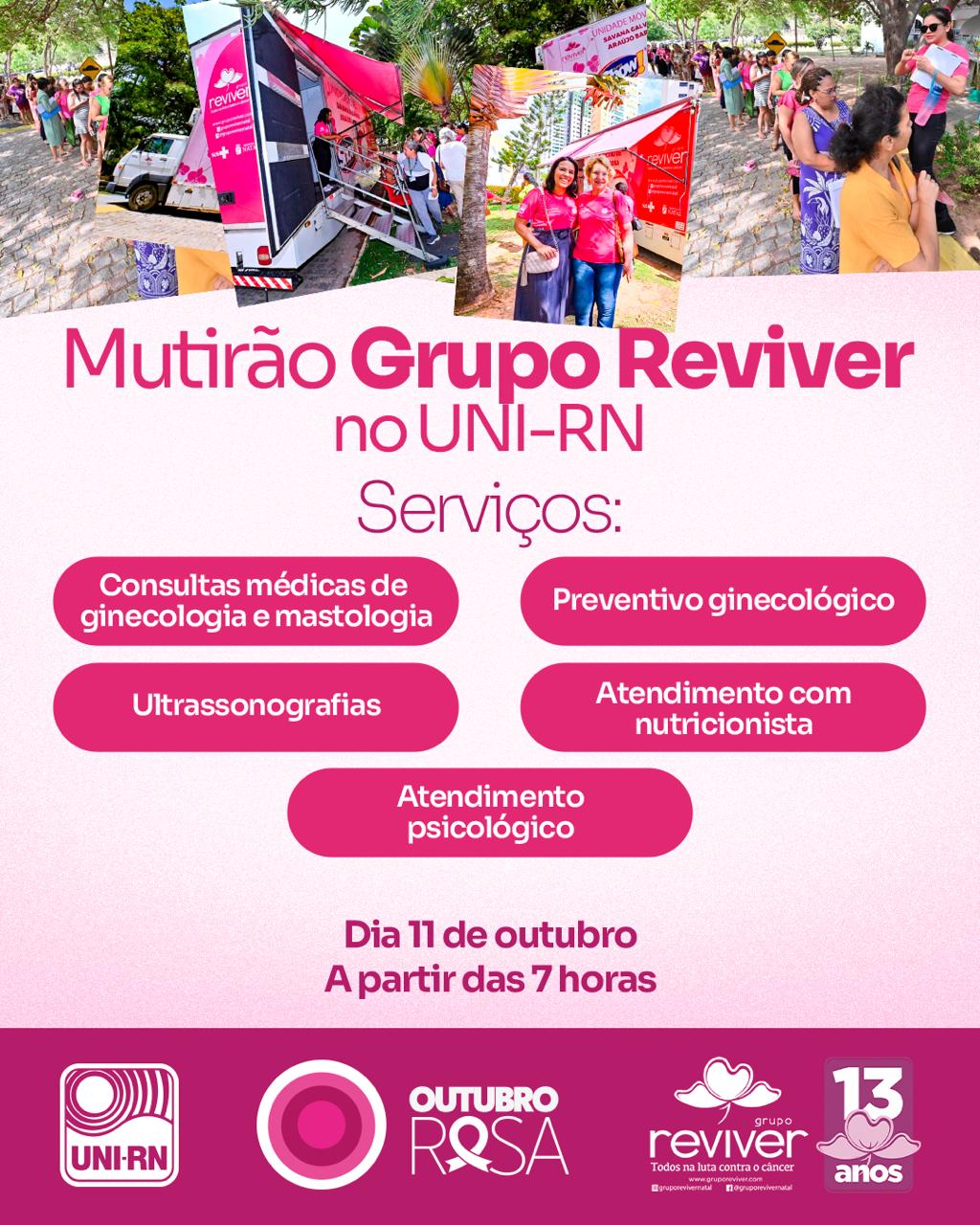 O Centro Universitário do Rio Grande do Norte (UNI-RN) será palco, no próximo sábado, dia 11 de outubro, de uma mobilização em prol da saúde feminina. A iniciativa, que integra a campanha Outubro Rosa, é realizada em parceria com o Grupo Reviver, referência no combate e prevenção ao câncer de mama e de colo do útero.