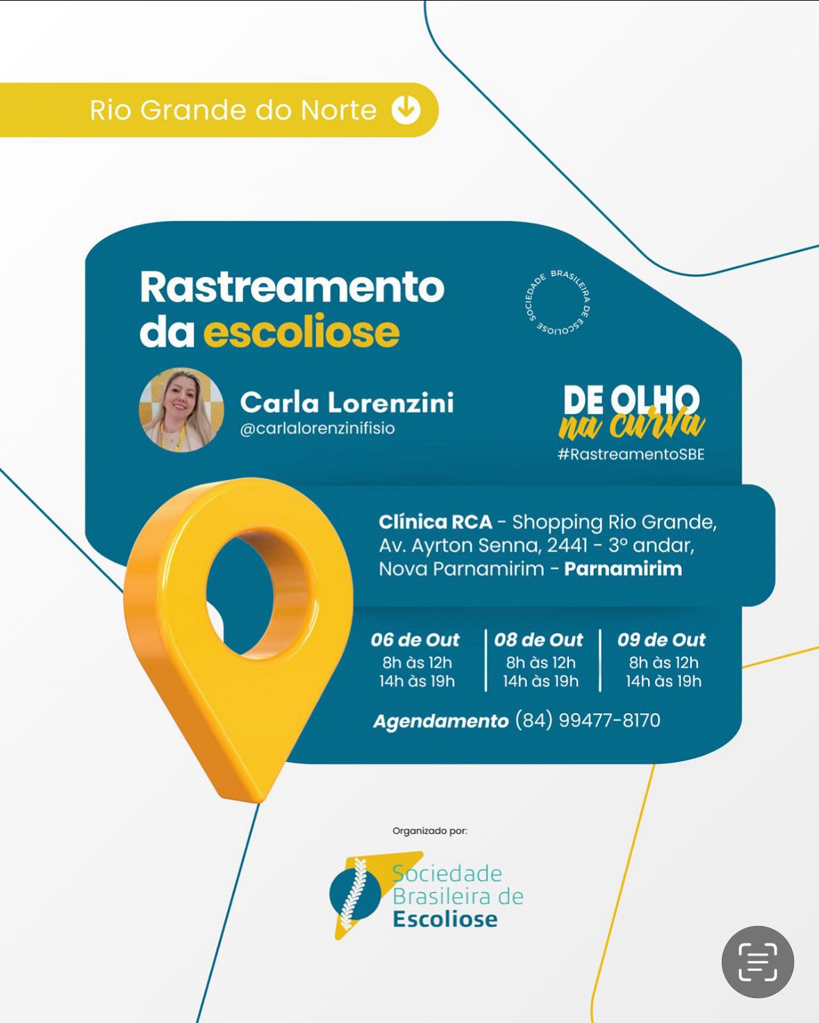 De 06 a 11 de outubro, Natal participa do Rastreamento Nacional da Escoliose, iniciativa que percorrerá diversas cidades do Brasil para identificar precocemente desvios na coluna de crianças e adolescentes. Na cidade, os atendimentos serão realizados pela fisioterapeuta Carla Lorenzini, da Clínica RCA, de forma gratuita.
