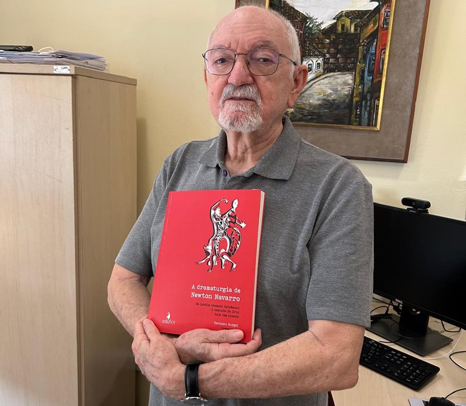 Tarcísio Gurgel com o livro “A dramaturgia de Newton Navarro” – Foto: Maralice Freitas