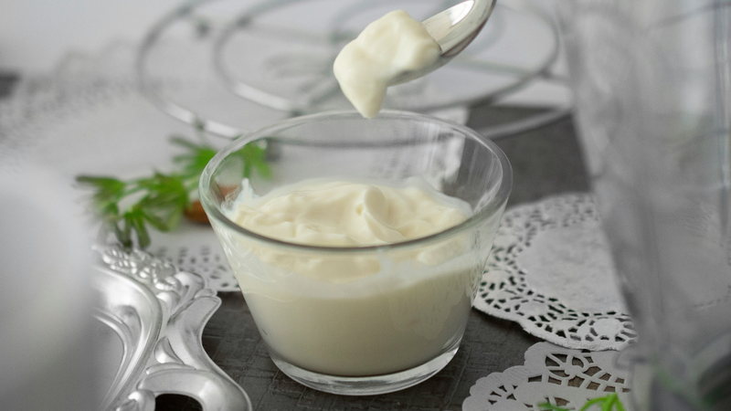 Em um recipiente de vidro, coloque o iogurte natural e adicione um pouco do leite morno, misturando bem.